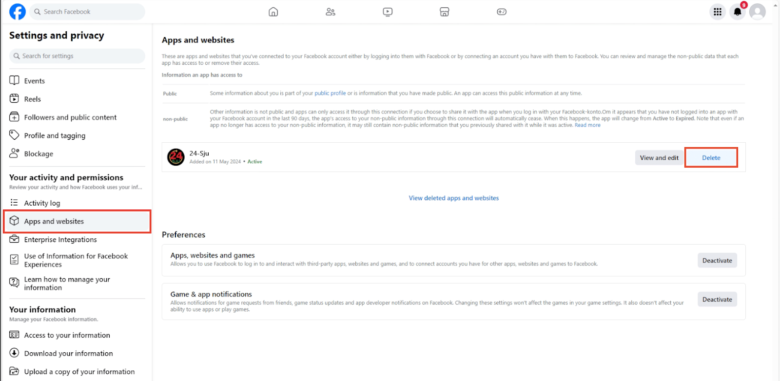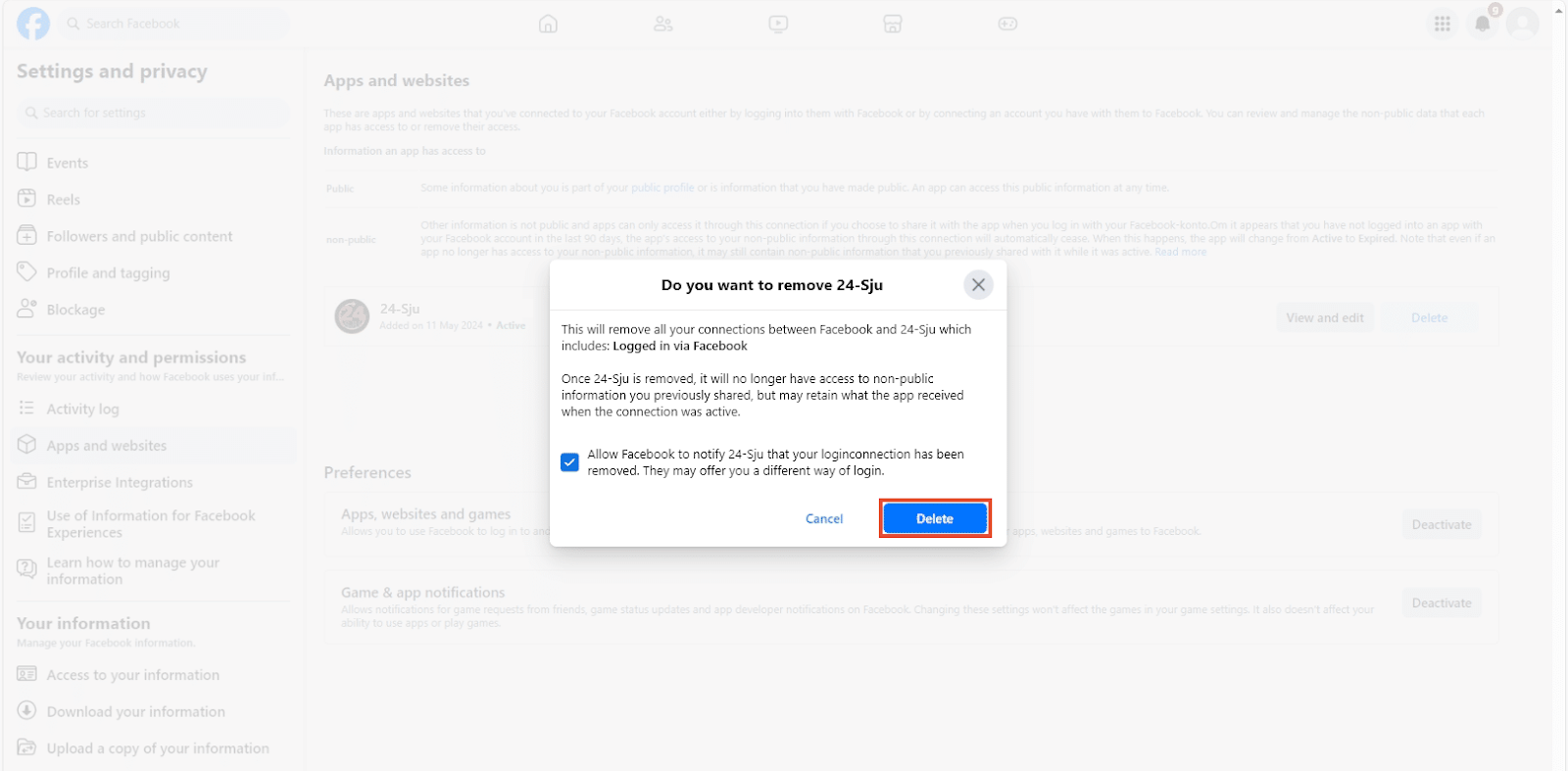 3. Look for Apps and Websites you will see lists of all the apps and websites you linked with your Facebook Account. Select the app or website to remove, then click Delete.